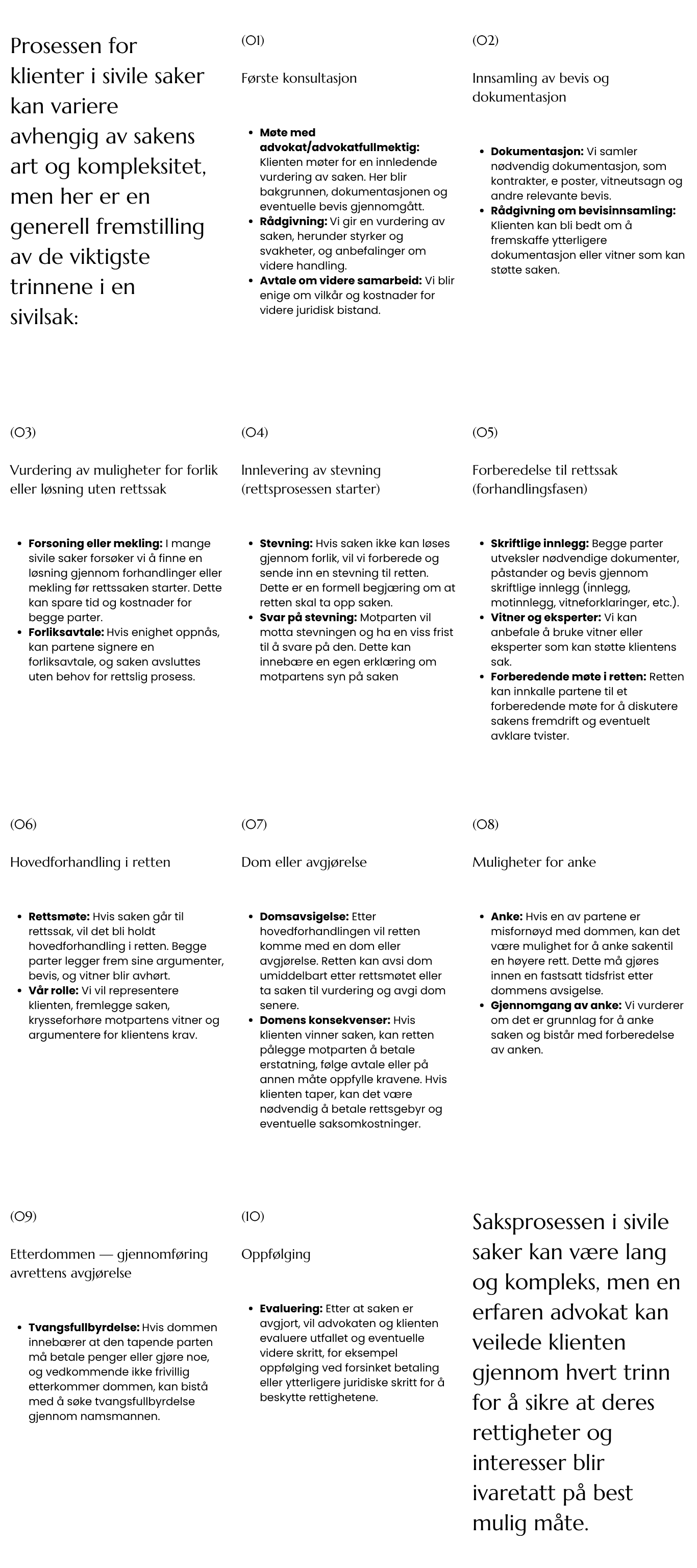 Prosessen for klienter i sivile saker kan variere avhengig av sakens art og kompleksitet, men her er en generell fremstilling av de viktigste trinnene i en sivilsak: